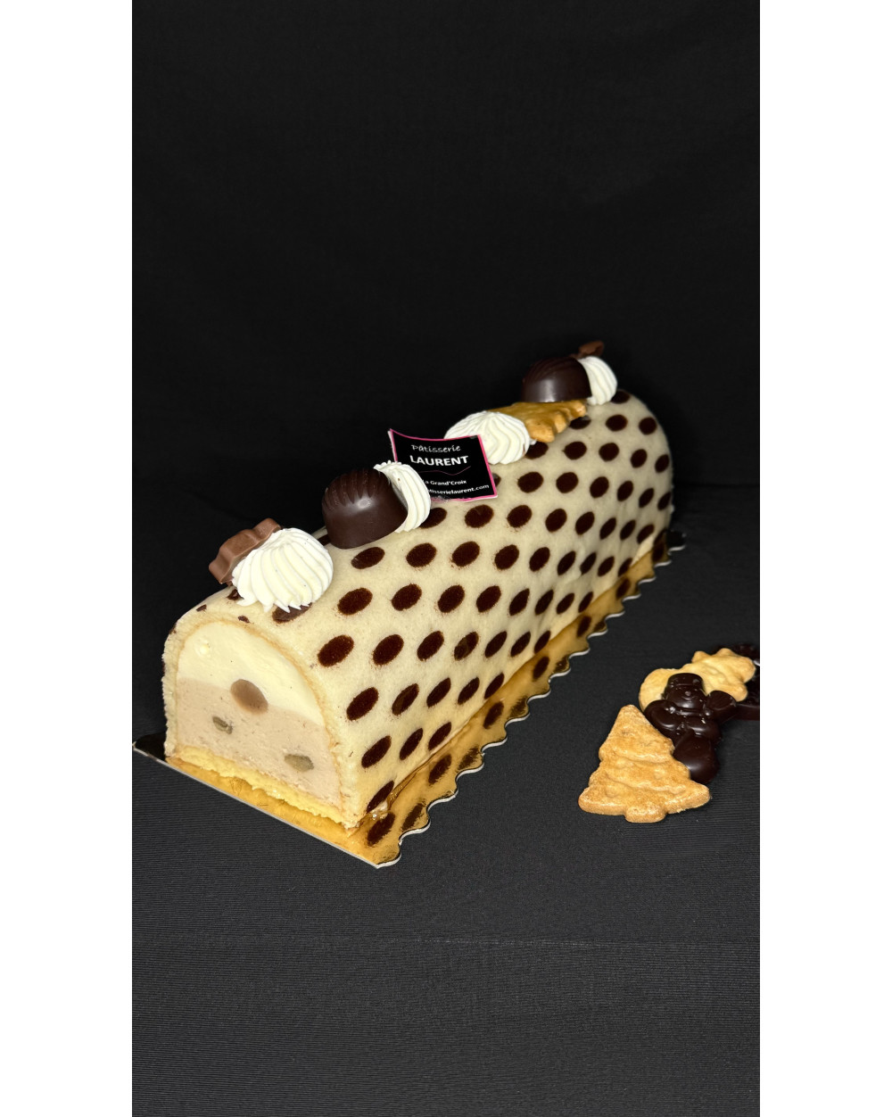 Une mousse au marron, une crème légère vanillée, garnie de brisures de marrons de l'ardèche, sur un biscuit.